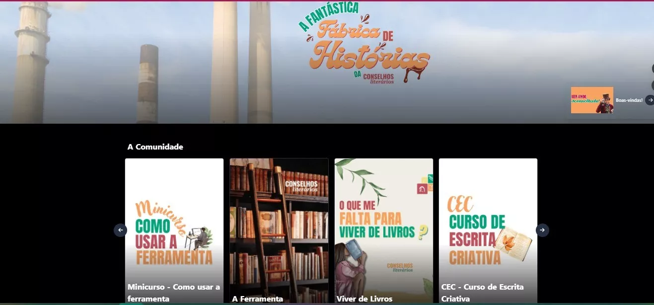 Ao adquirir a assinatura da comunidade, além do acesso à Fantástica Fábrica de Livros, você terá acesso a todas as aulas gravadas dos cursos antigos e novos da Conselhos Literários, sempre atualizados, ou seja, mantendo a assinatura, seguirá recebendo novos materias para ver quando e onde quiser.