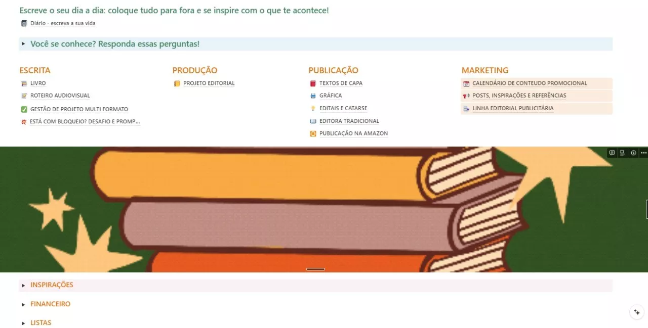 Uma ferramenta incrível de gestão de projetos que ajudará autores e profissionais que querem viver dos livros. Na ferramenta terá o MAPA DO LIVRO, que auxiliará na escrita da idealização até a publicação da história.